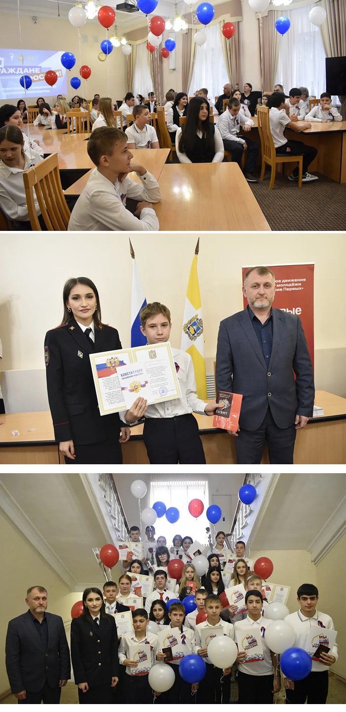 Первые и самые важные документы школьникам, достигшим 14 летнего возраста, вручили заместитель главы администрации Минераловодского муниципального округа Ставропольского края - Чижик Андрей Александрович и заместитель начальника отдела по вопросам миграции отдела МВД России "Минераловодский" старший лейтенант - Мадина Наримановна Махмутова.