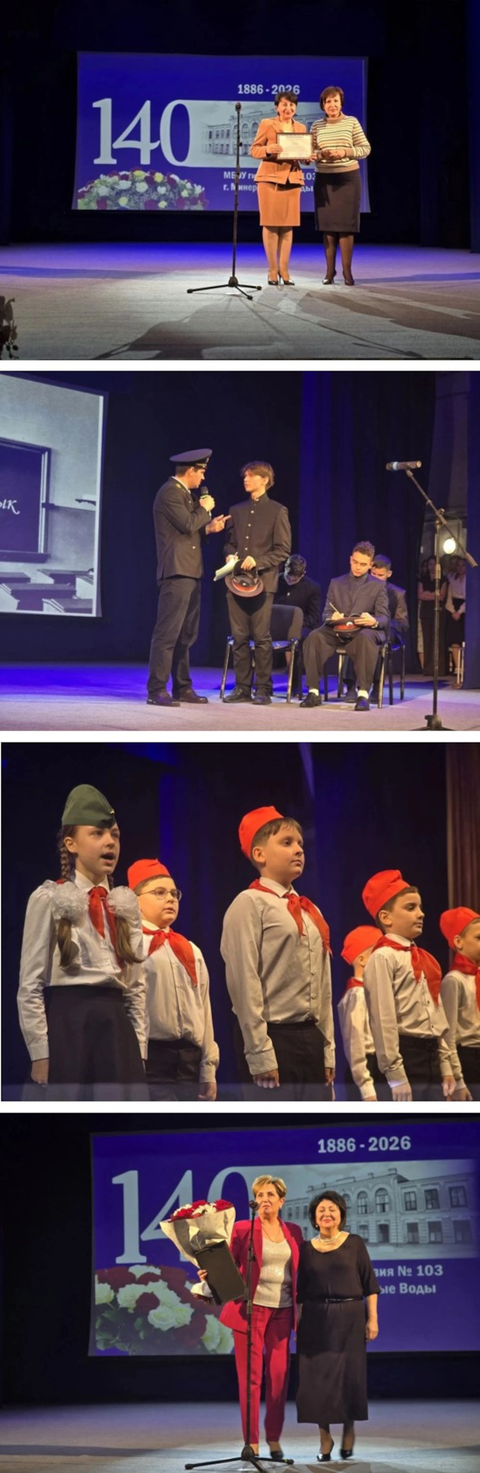 В ходе торжественного мероприятия во Дворце культуры в формате иммерсивного спектакля гостям представили всю историю, весь путь, испытание войной и возрождение. На экране – уникальные кадры первых учеников, идущих по лестницам школы.