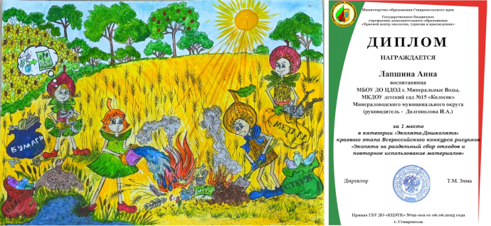 Вот очередной успех! Воспитанница детского сада, Лапшина Анна с мамой, нарисовала рисунок «Эколята за раздельный сбор мусора» и заняла 1 место в краевом этапе Всероссийского конкурса рисунков «Эколята за раздельный сбор отходов и повторное использование материалов» в категории «Эколята-дошколята».